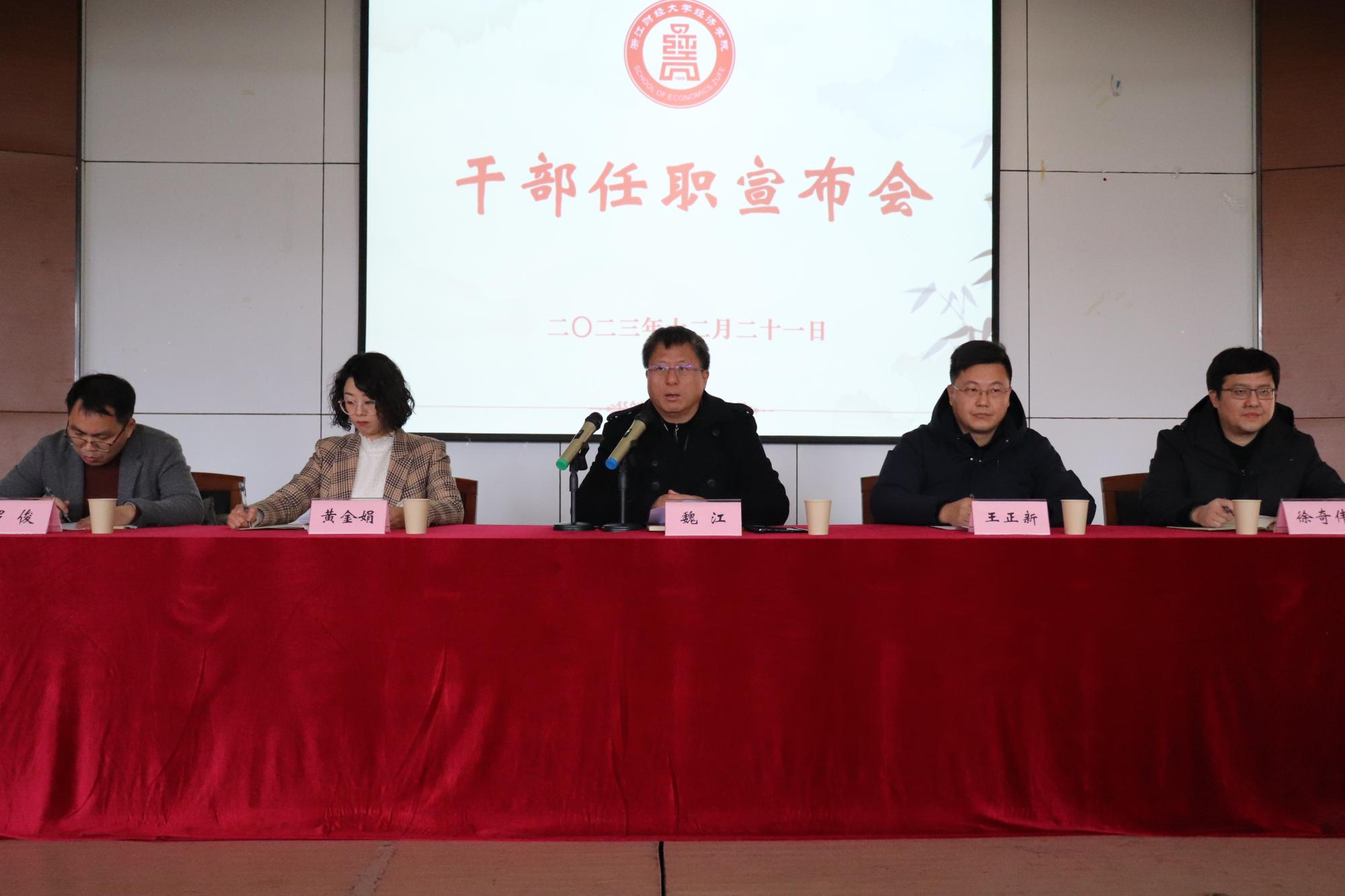 魏江介绍了徐奇伟、罗俊两位同志的情况,对他们的任职表示祝贺,并希望他们紧紧依靠广大师生,锐意进取、改革创新,切实肩负起领导学院创新发展的重任,推动学院各项事业再上新台阶,不辜负学校党委和学院全体师生的信任和重托。同时,他代表学校党政对学院发展和班子建设提了三点希望:一是提高政治站位,建立新结构人才培养体系,努力培养社会主义建设的合格接班人;二是建设强大学科体系,在服务国家重大战略与构建中国特色的经济学自主知识体系方面有所突破;三是探索党建机制,将党建融入学科建设、科学研究、人才培养等学院中心工作中,开创学院发展新局面。