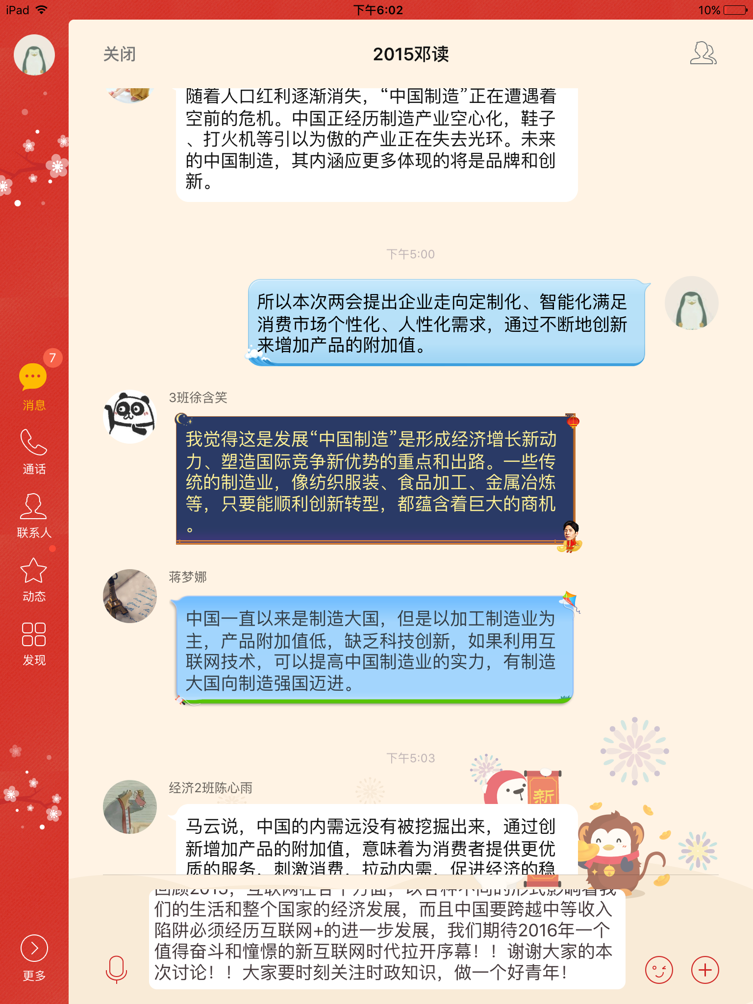 3月17日至3月20日期间,学院各支部,各班及社团邓读对两会相关热点问题进行了热烈的线上讨论,同学们积极参与,通过QQ群,微信群对就业、高等教育、创新创业、民生等问题进行了交流。其中,第二党支部对两会中“大众创业,万众创新”的话题进行了讨论,指出拥有了众创的平台才能使创新意识和作品有更好的展现空间,也对学校建设创新创业型大学,进一步培养学生创新意识表示支持。第三党支部重点关注了两会中与杭州相关的一些话题,如杭州医改政策,杭州发展模式和G20峰会等,从身边热点出发,具有敏锐的洞察力。研究生第一党支部凭借专业知识对供给侧改革进行热议。在各班讨论中,14经济一班查询了中青舆情检测室检测两会相关信息的数据,显示出国民对两会的关注热度。15国民经济的同学对两会中的“中等收入陷阱”提出了自己的意见。邓小平理论读书协会重点关注了两会中的“中国制造+互联网”,指出通过产品创新走向“中国智造”。